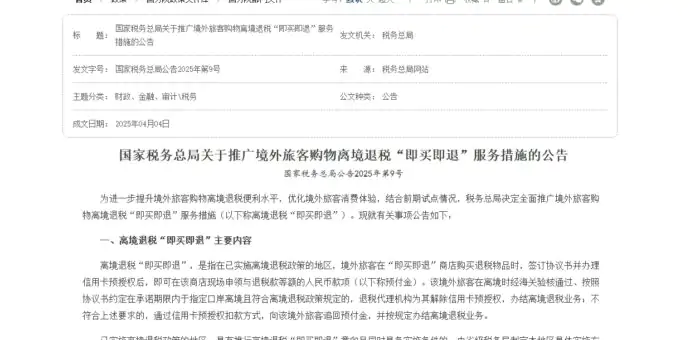 国家税务总局关于推广境外旅客购物离境退税“即买即退”服务措施的公告 国家税务总局公告2025年第9号 为进一步 … 继续阅读 国家税务总局关于推广境外旅客购物离境退税“即买即退”服务措施的公告