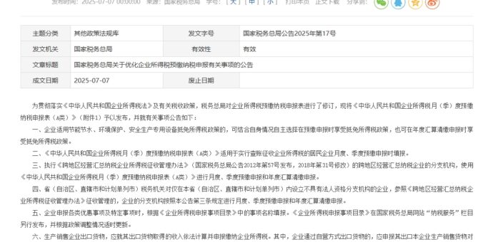 国家税务总局公告2025年第17号 为贯彻落实《中华人民共和国企业所得税法》及有关税收政策,税务总局对企业 … 继续阅读 国家税务总局关于优化企业所得税预缴纳税申报有关事项的公告